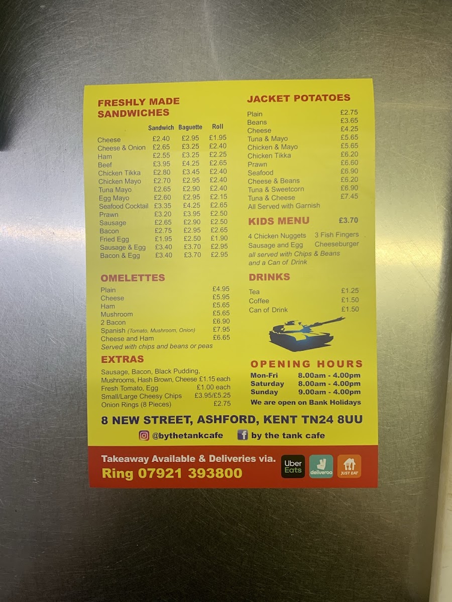 The menu at By The Tank Cafe offers a delightful variety of dishes that cater to various tastes and preferences, all served in a welcoming atmosphere. For those craving a hearty start to the day, the All Day Breakfast section is the go-to, featuring options like Breakfast A, Breakfast B, and the substantial Mega Breakfast. Vegetarians can enjoy the Vegetarian Breakfast, while the Tank Breakfast provides a robust meal for those looking for something more filling.