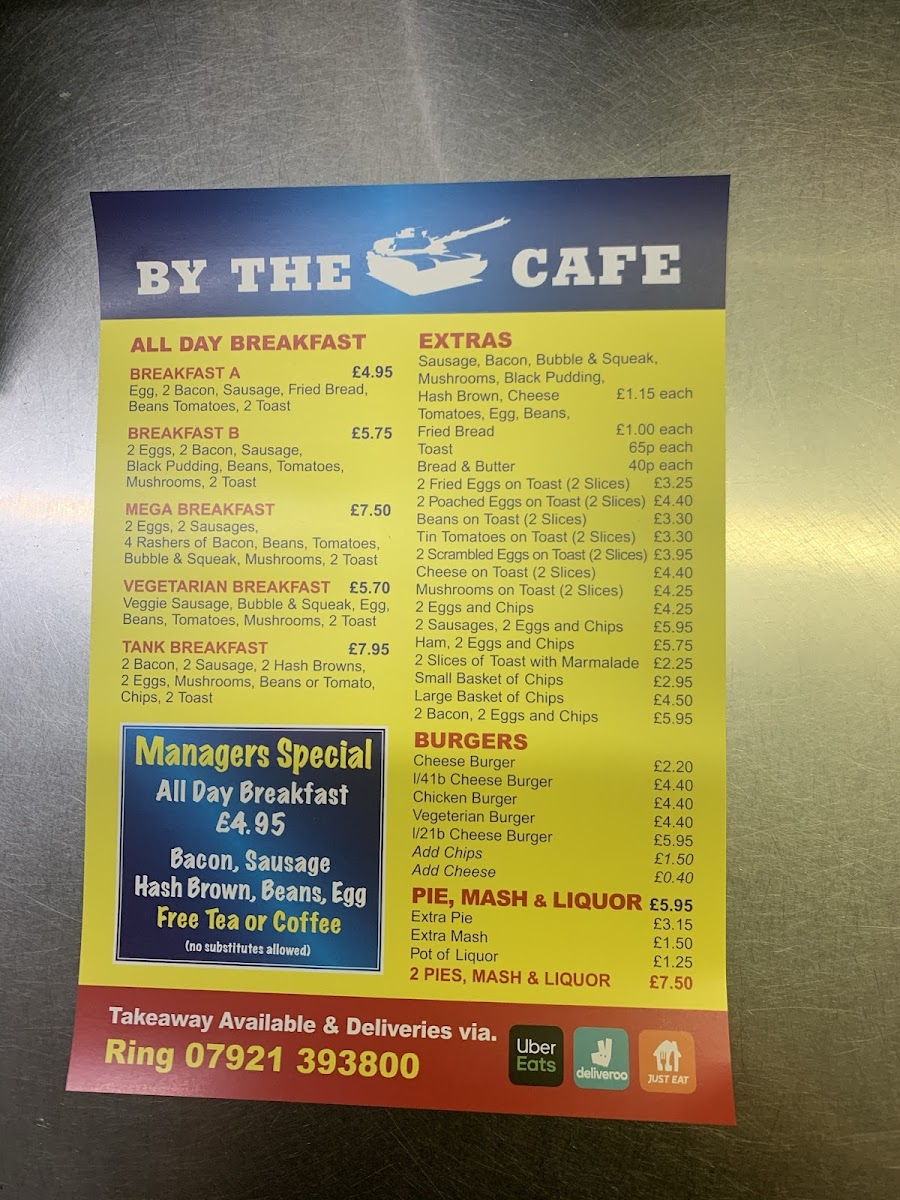 In summary, By The Tank Cafe provides a diverse and satisfying menu that caters to both hearty appetites and lighter tastes, with options ranging from traditional breakfast dishes to classic sandwiches, burgers, and more. Whether you're stopping in for a full meal or a quick bite, the cafe offers something for every palate.